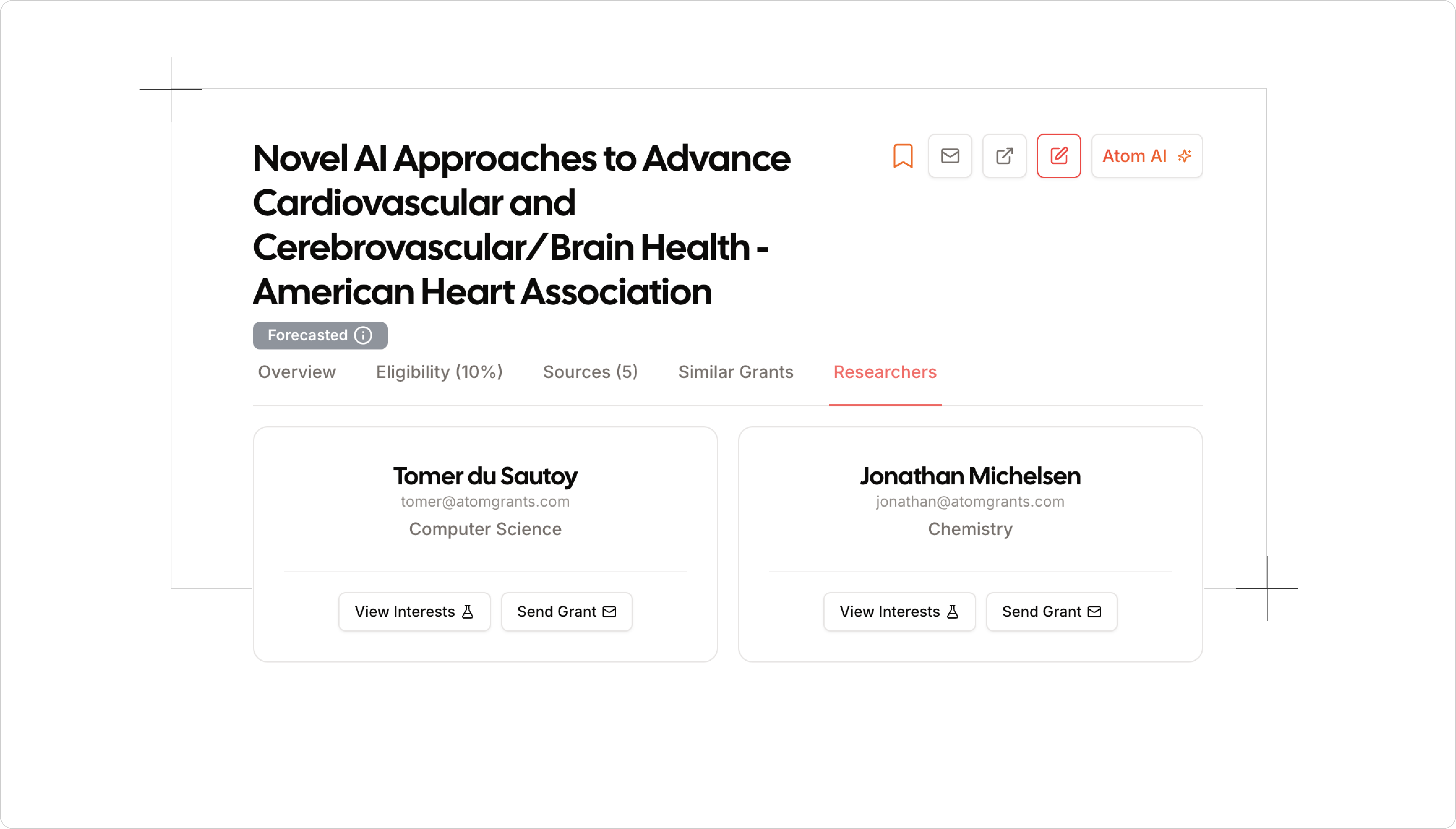 We’ve also added a new “Researchers” tab to every grant listing. When you open a funding opportunity, Atom Grants now automatically displays researchers at your institution who are a strong fit for that opportunity, based on their research interests, prior work, and profile data.
