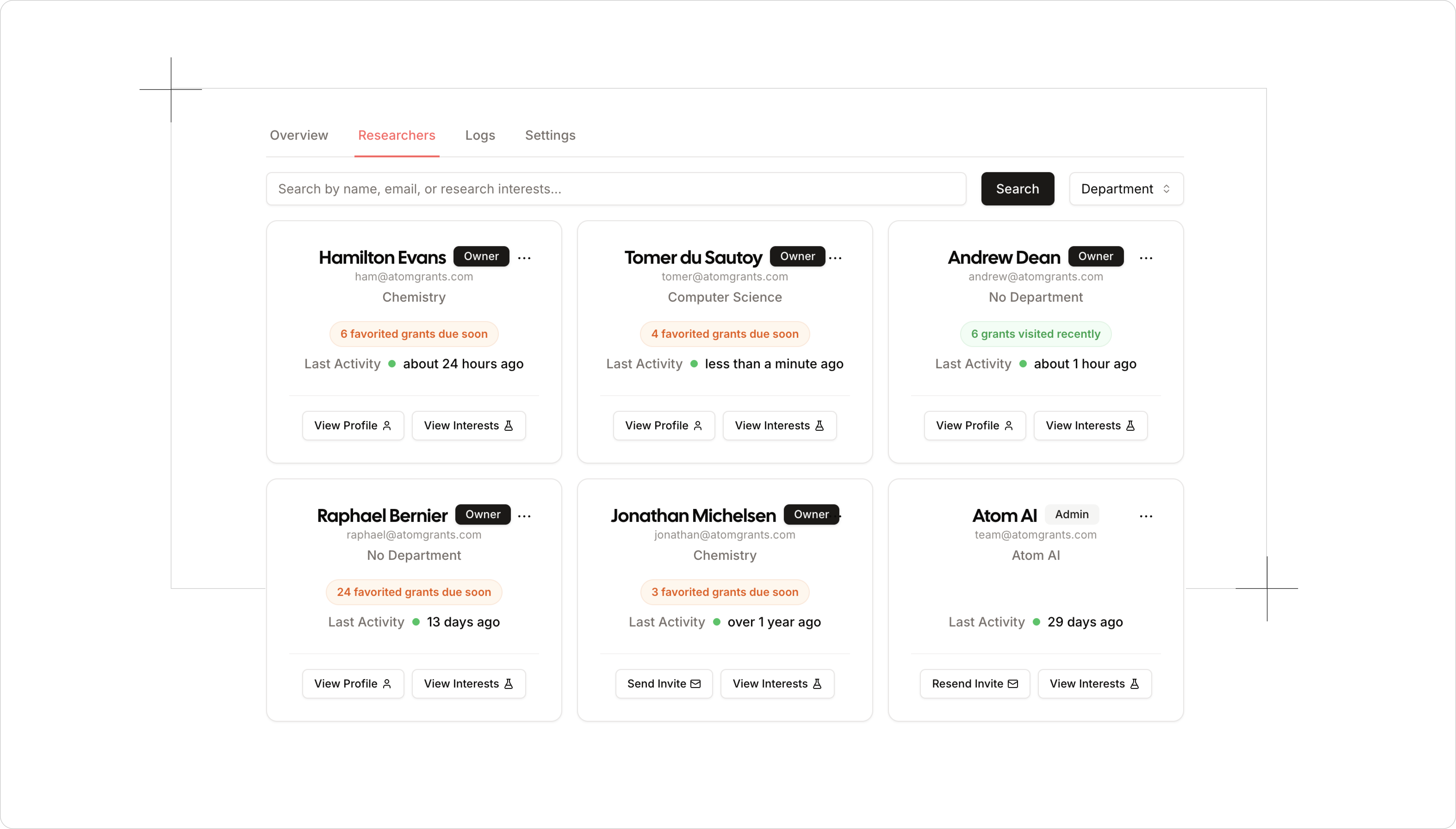 Admins can now search through their institution’s researcher directory using the same AI-powered semantic search engine that drives Atom’s external grant discovery.