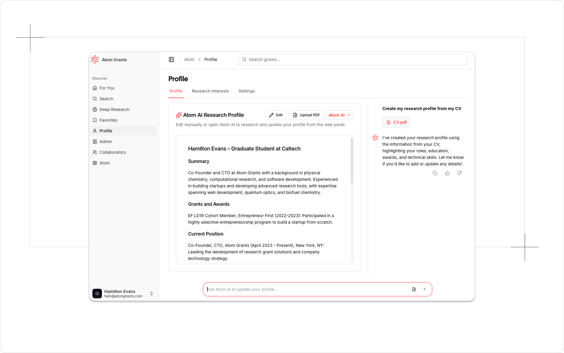 Researchers or administrators upload a file directly in the profile assistant chat. The assistant analyzes the document and identifies data that can strengthen the user profile. That might include publication lists, funding history, keywords, departmental roles, expertise descriptions, or key accomplishments. Atom's AI will automatically format and add the relevant information.