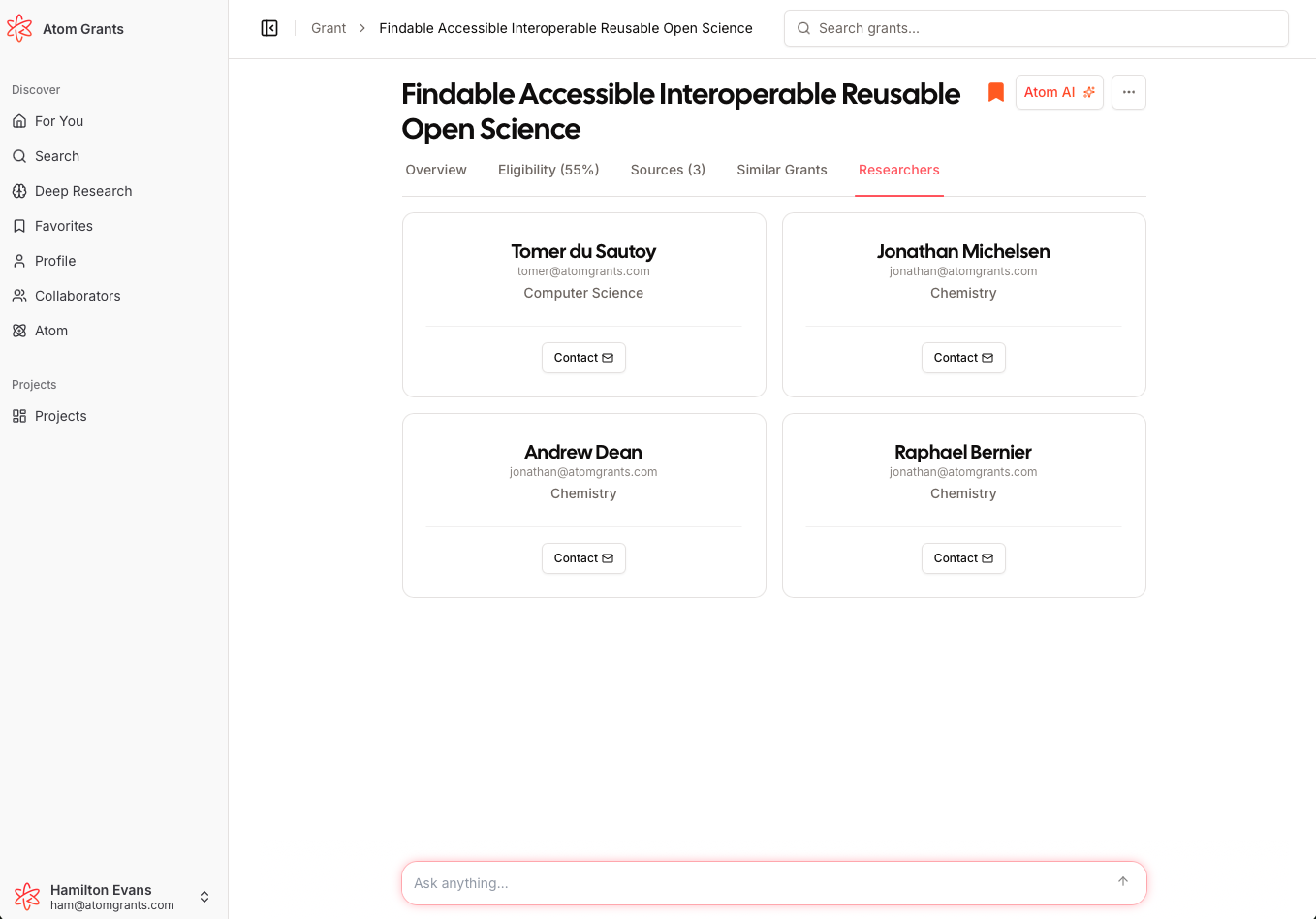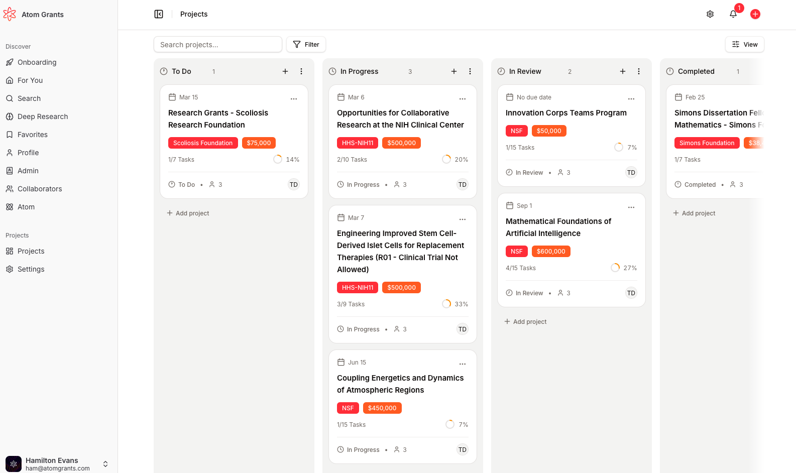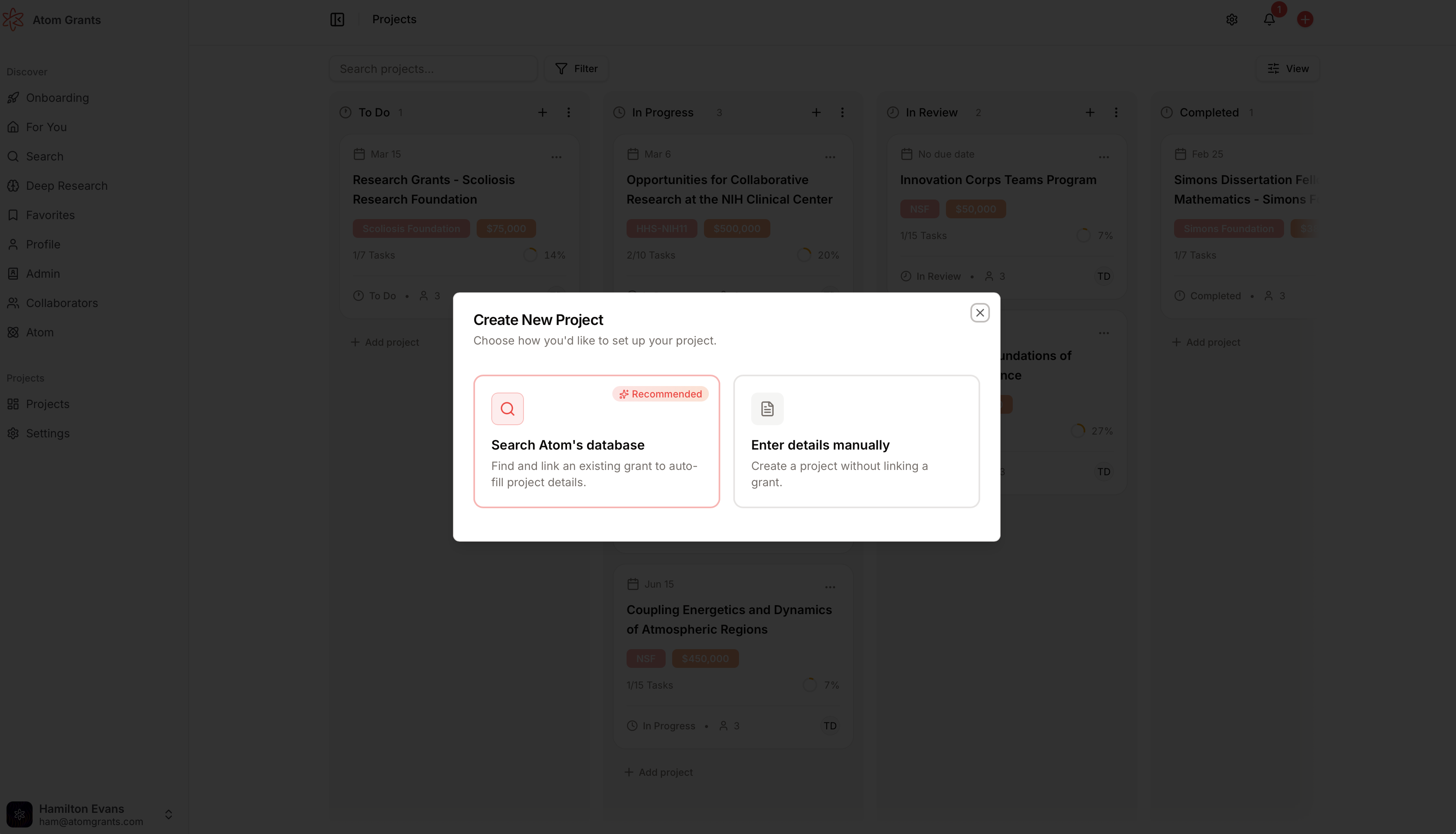 - Step-by-step onboarding: Link grants, enter project details, assign team members with roles (PI, Co-PI, Admin, Contributor), and configure task generation in a clear, progressive flow