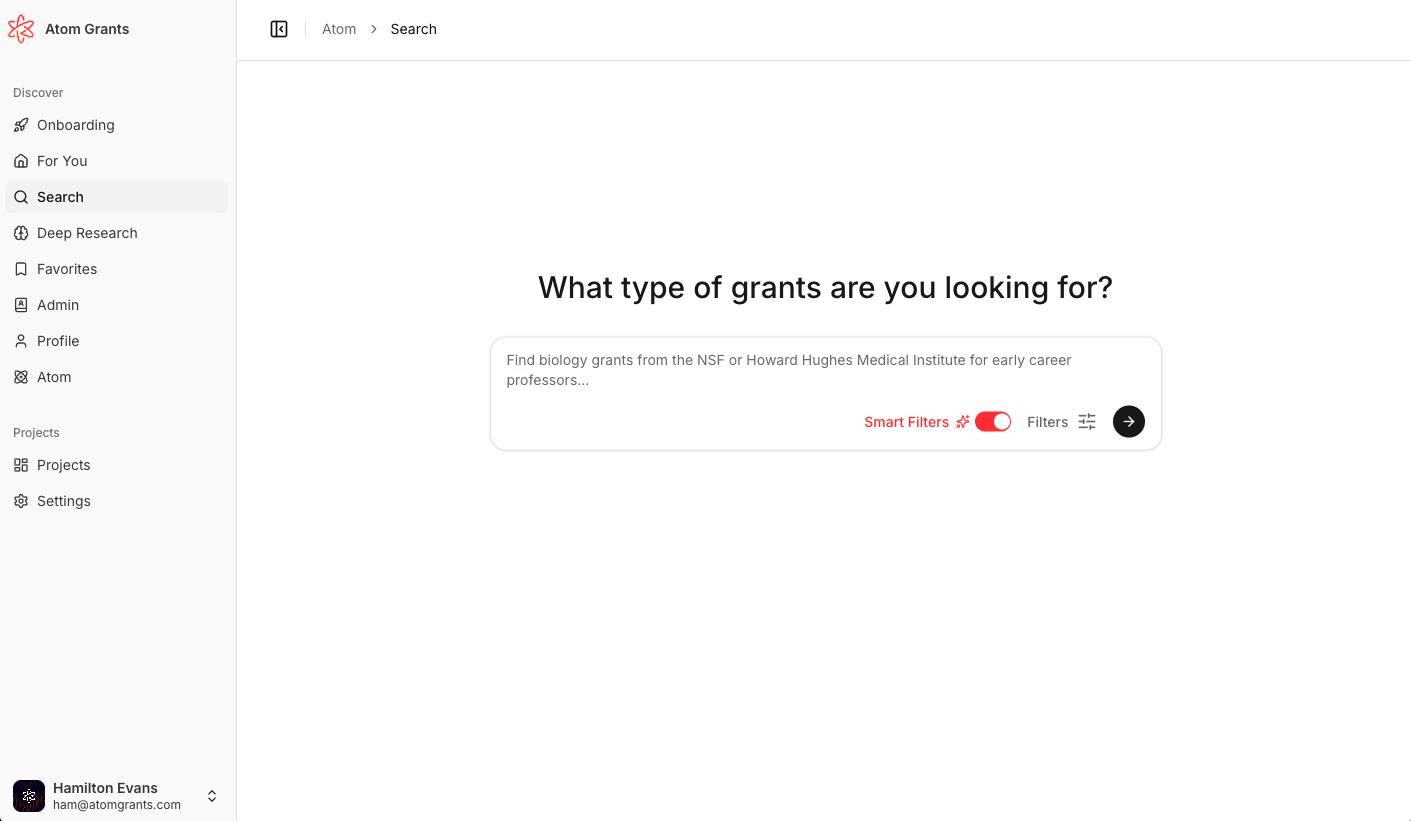 Searching for grants is now even more intuitive with the introduction of AI-powered smart filters. You can toggle AI search on or off, and Atom will remember your preference to deliver the best results for you. Filters will be automatically extracted from your search term - for example, Biology grants for early career researchers from the NSF will turn into a search for Biology with filters for Career Stage: Early Career Researchers and Funder: NSF.