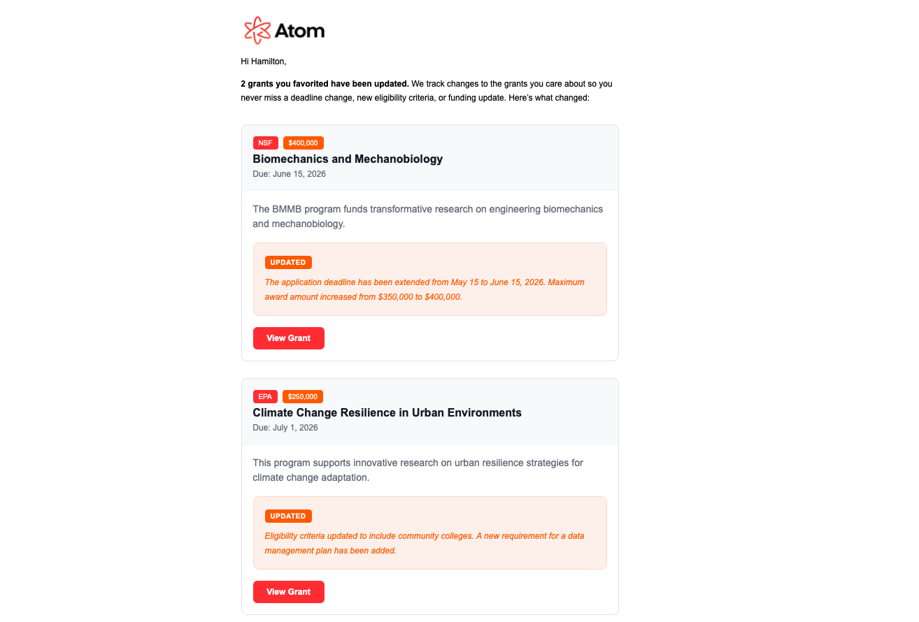 Never lose track of your favorite grants again! Atom now automatically checks in with users who favorited a grant after its deadline, asking if they applied. This helps you stay organized and gives the Atom team valuable feedback to improve recommendations.