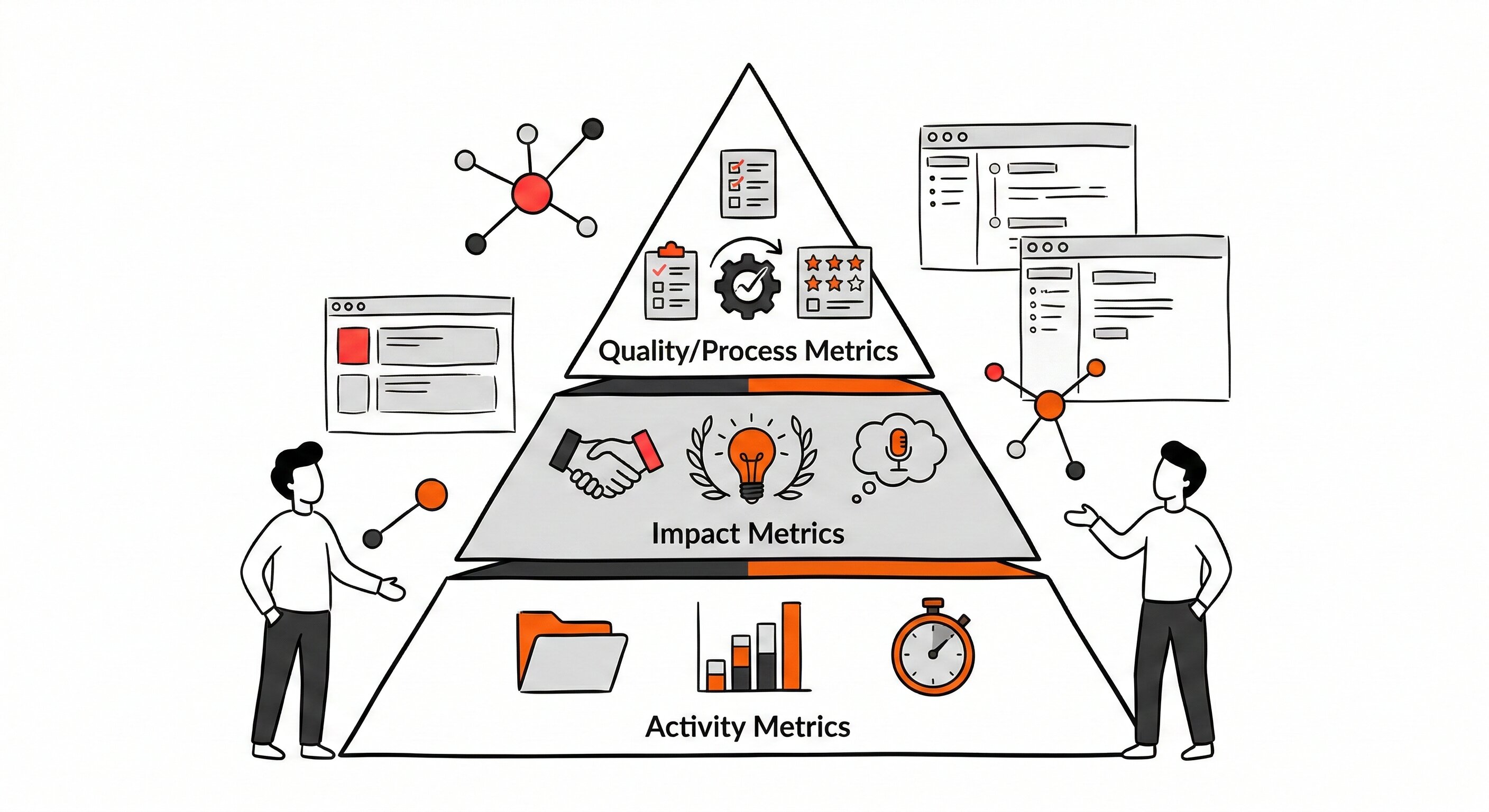 The conversation around assessing RD often gets stuck on simple win/loss rates. Kimberly suggests moving toward a more nuanced, three-tiered approach to metrics. This approach acknowledges the indirect relationship between RD efforts and eventual research outcomes.